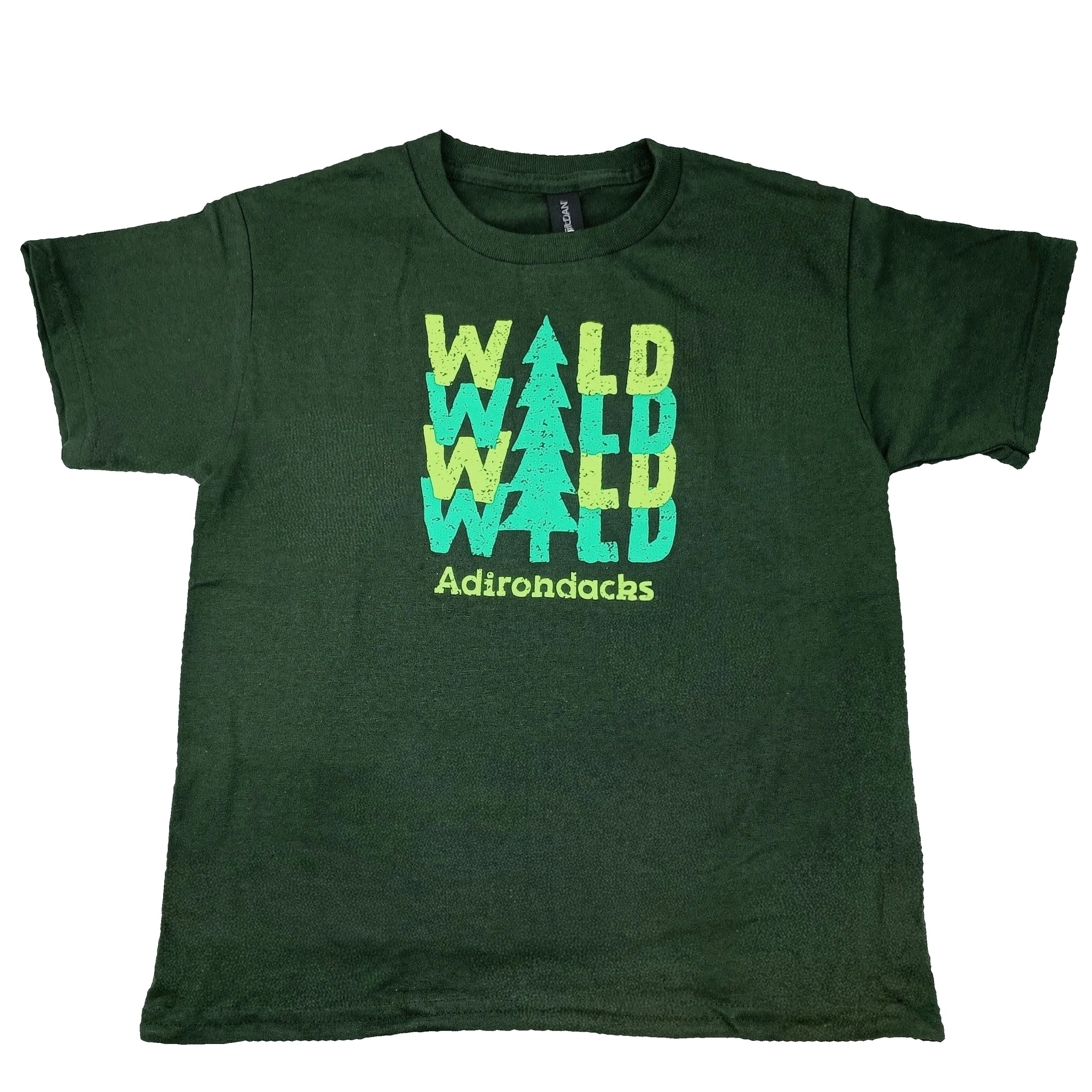 This tee features the words "WILD WILD WILD WILD Adirondacks" stacked vertically and the letter "I" in the words "WILD" create a tree, perfect for your wild child! 100% cotton