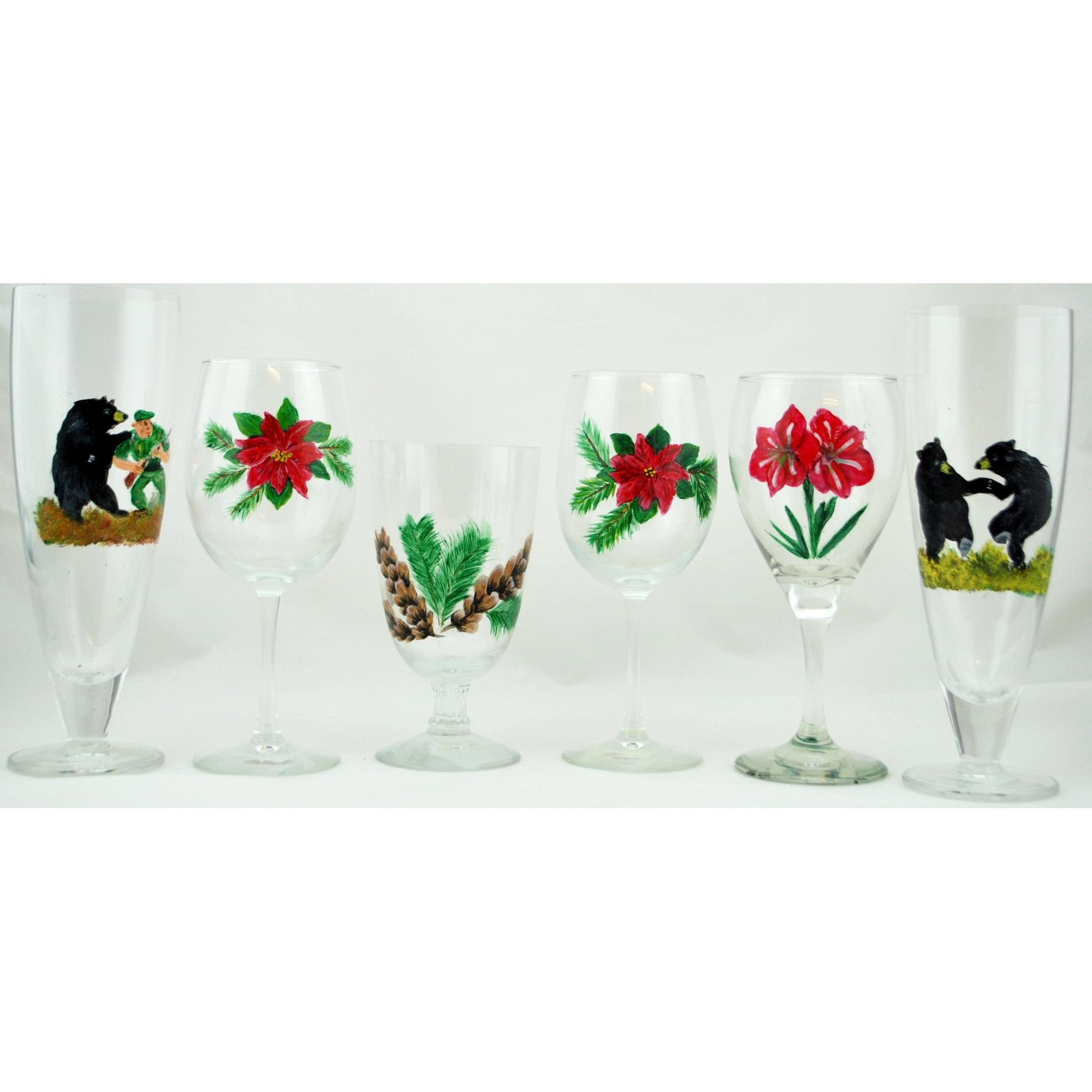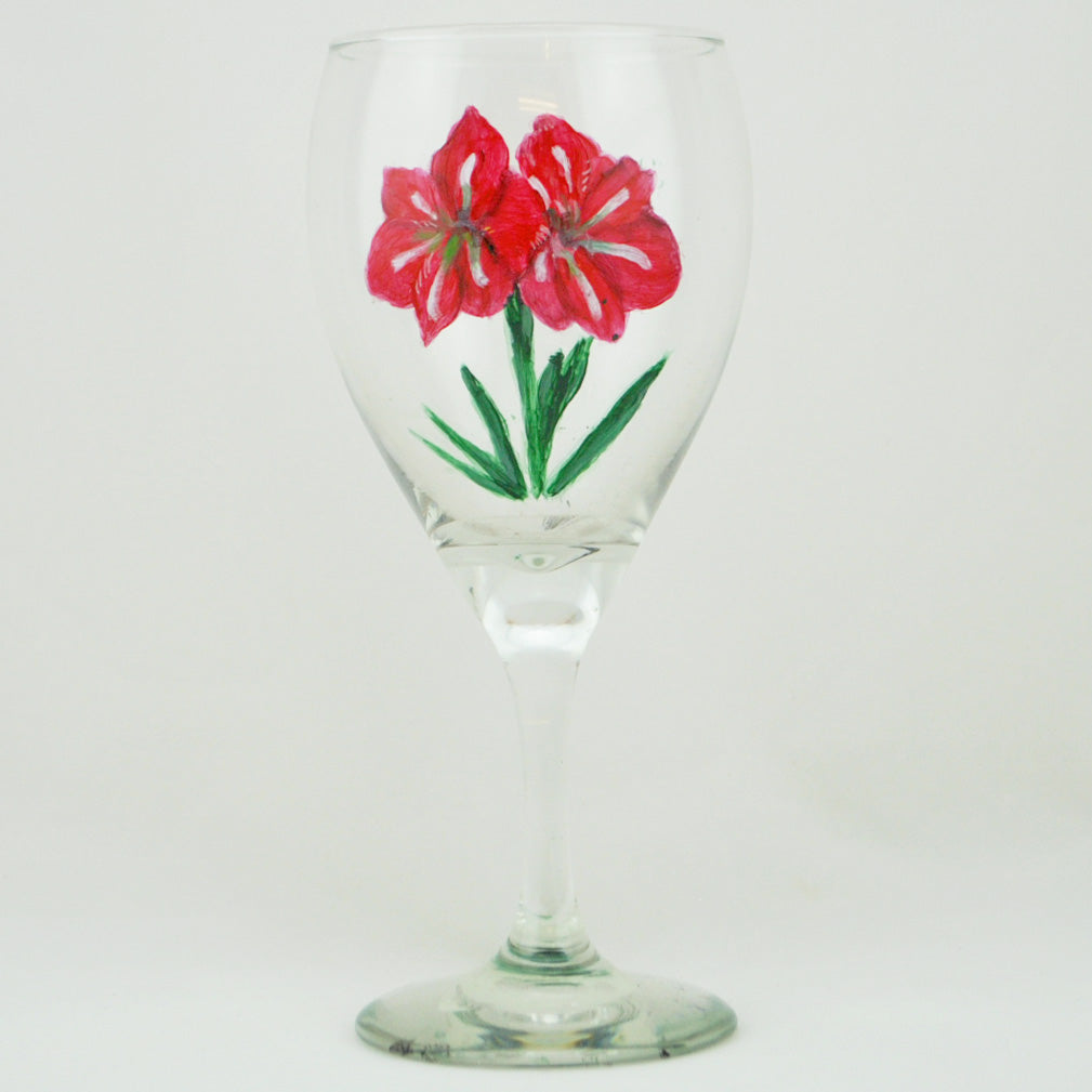 These wine glasses are all one-of-a-kind hand-painted glasses by Annelies Taylor. They come in varying sizes and styles.