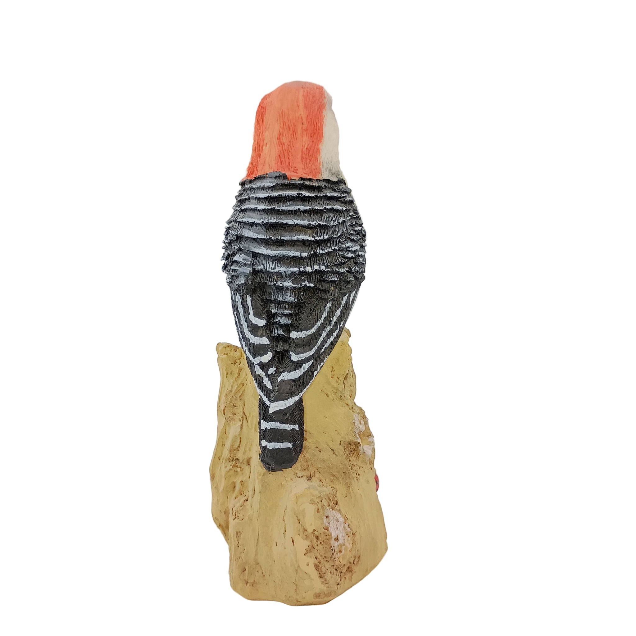 A resin figurine of a woodpecker on a log with a ladybug. Figurine stands 6.25" tall and 2.5" wide